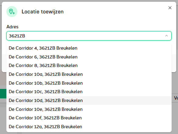 Met Locatie toewijzen kan een nieuwe locatie worden aangemaakt en direct worden gekoppeld. Voer (een deel van) het adres in; de tool zoekt dit op in de gemeentelijke basisadministratie. Selecteer daarna het juiste adres uit de lijst. Wordt het adres niet gevonden, kies dan voor “Adres niet gevonden?” om de gegevens handmatig in te voeren. Bevestig met OK om de locatie aan te maken en de meetset te koppelen.