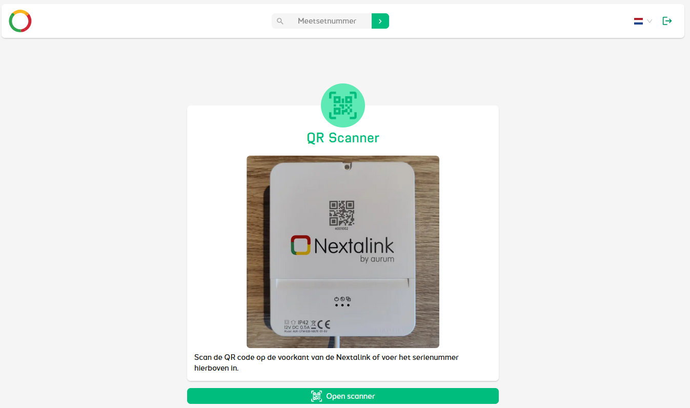 Na het openen van de tool kan bovenin het scherm het serienummer van een meetset worden ingevoerd. Het is ook mogelijk om de QR-code van het apparaat te scannen.