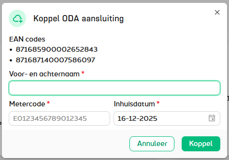 3. Vervolgens worden de EAN codes van de aansluiting(en) opgehaald. Vaak gaat het om de code voor een gas- en een elektriciteitsmeter. Als op de locatie al een naam bekend is, wordt deze automatisch ingevuld. Eventueel kan de naam worden aangepast. Deze moet overeenkomen met de naam op het energiecontract. Op de elektriciteitsmeter staat een metercode. Die moet hier worden ingevuld. Op basis van de metercode wordt gecontroleerd of je deze aanvraag mag doen en er akkoord wordt gegeven. Zorg dus dat deze juist is. Vul al laatste de inhuisdatum in. Deze wordt gebruikt om te bepalen vanaf welk moment er data opgehaald wordt. Er kan tot 13 in het verleden data opgehaald worden vanaf het moment van aanvraag. Als laatste klik je op “Koppel”